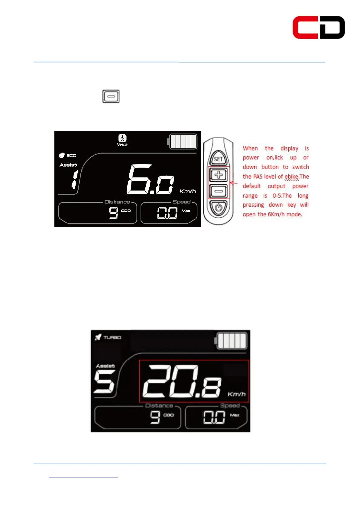 The long pressing key will enter the implementation mode of 6Km/h. The