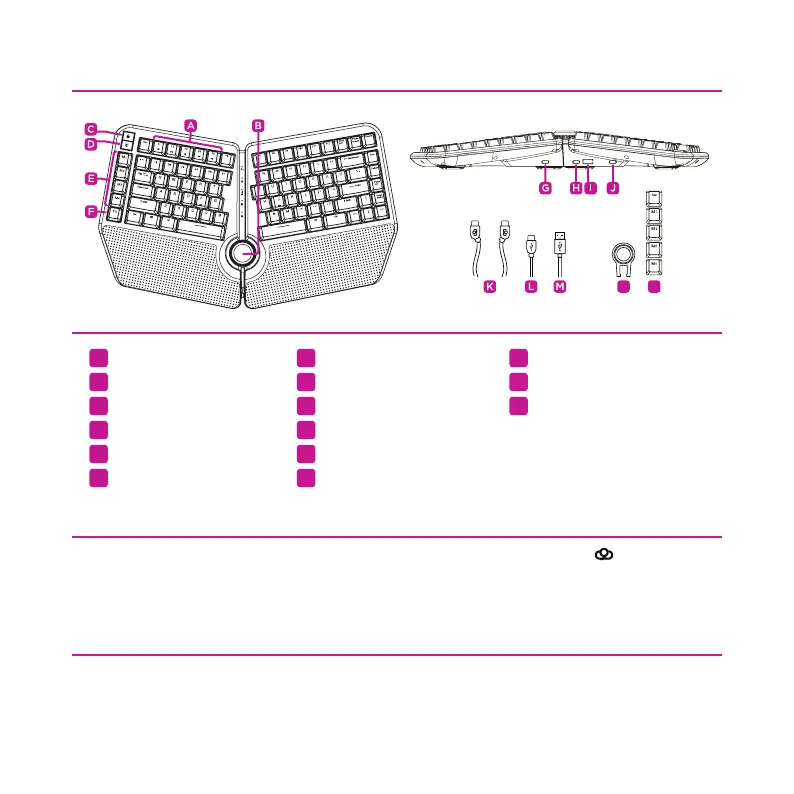 1) Connect the linking cable (K) to each of the keyboard interface ports (G,H). (Note: “ ” logo faces up.)