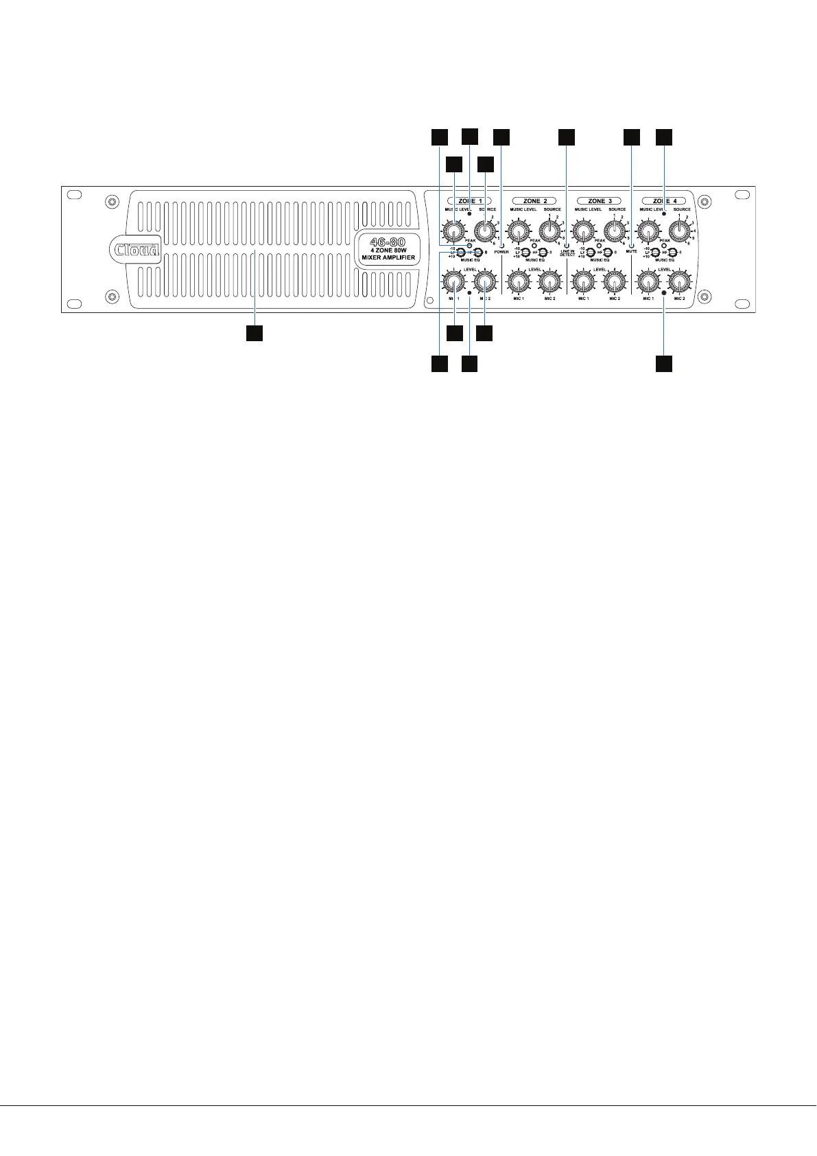 3. MIC 1 – adjusts the level of the microphone connected to the rear panel MICROPHONE 1/PAGE MIC input in each zone.