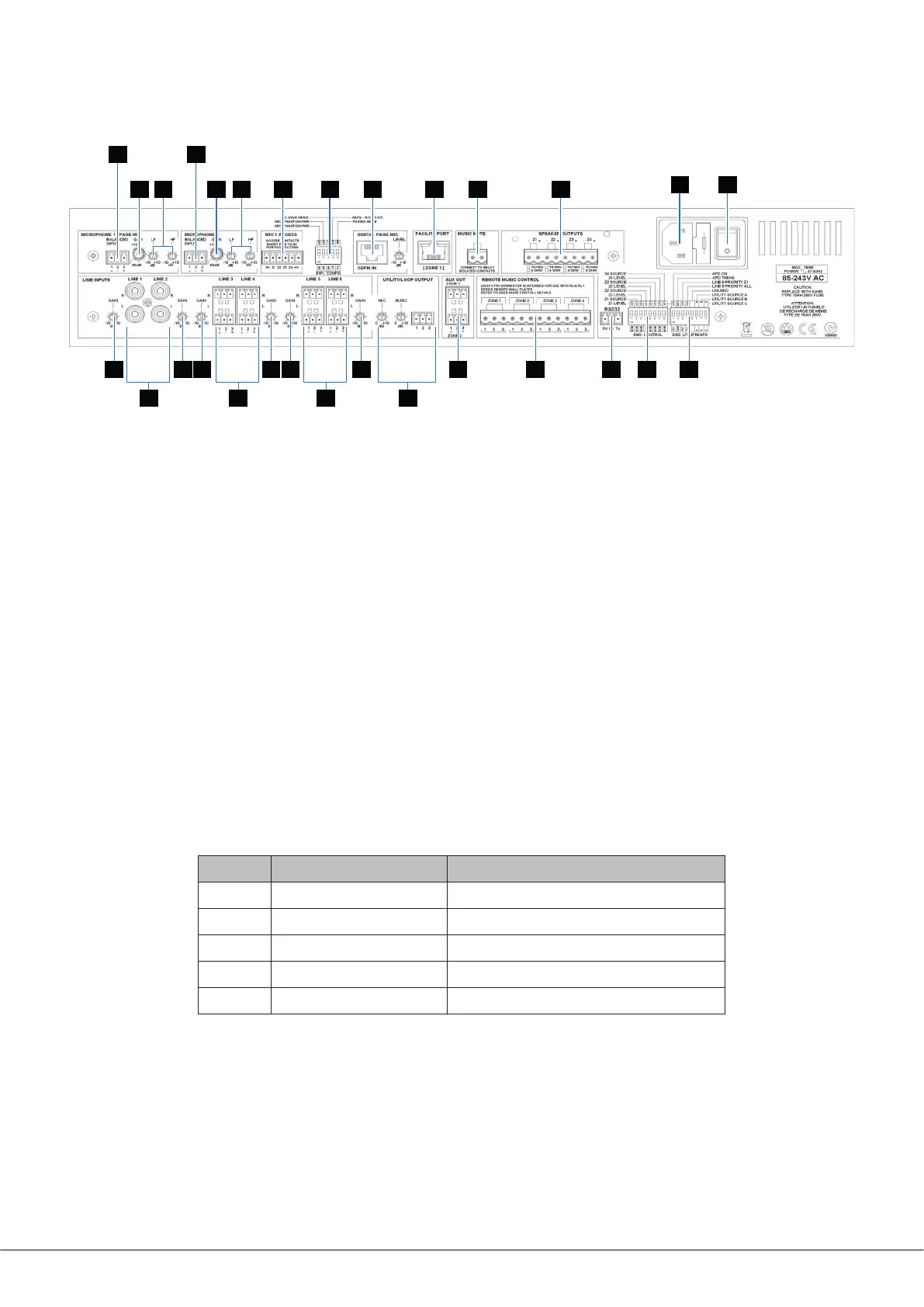 2. LINE 3 to LINE 6 – balanced line inputs for connection of music sources. Four 3-pin, 3.5 mm-pitch screw-terminal