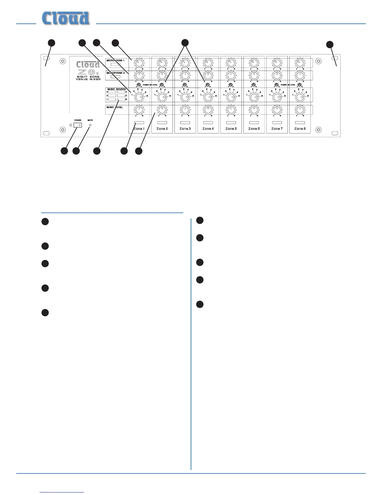 Cloud Z8II - Front Panel Controls and Indicators; Music Controls; Microphone and Paging Controls; Status and Identification Features
