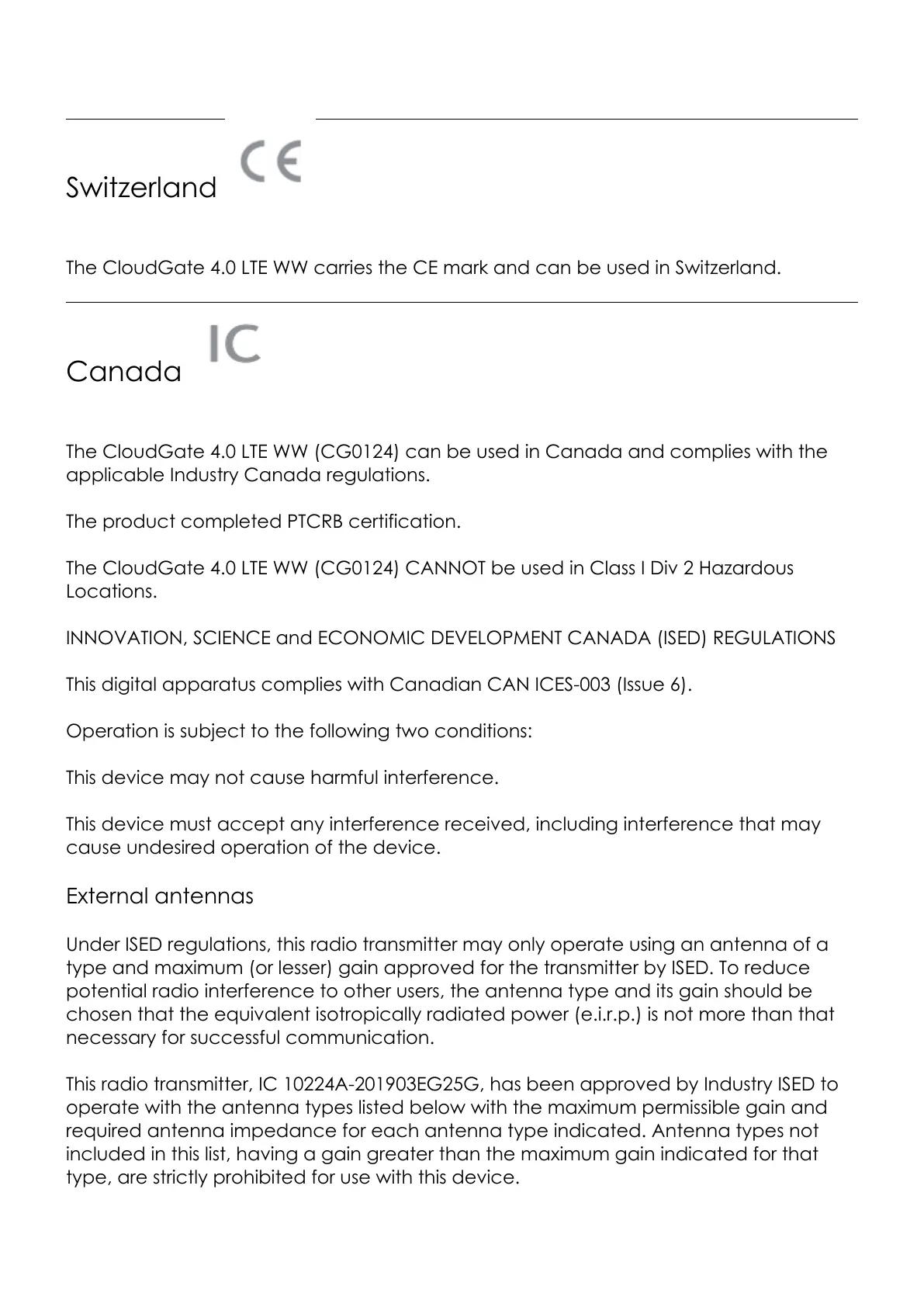 The CloudGate 4.0 LTE WW carries the CE mark and can be used in Switzerland.