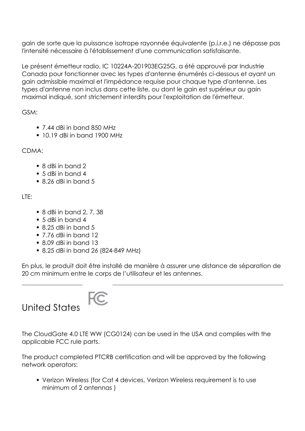 The CloudGate 4.0 LTE WW (CG0124) can be used in the USA and complies with the