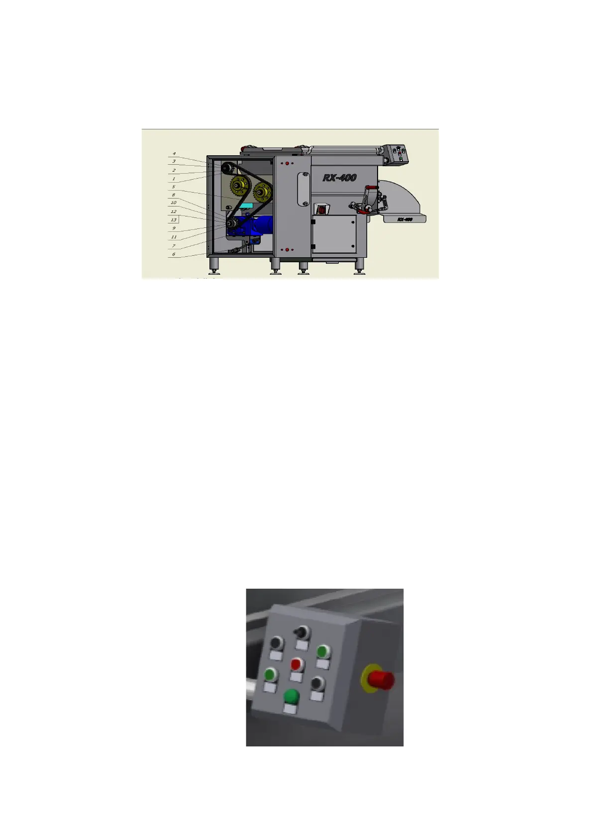 button, the green light indicator signalize operation of the machine, emergency STOP button,