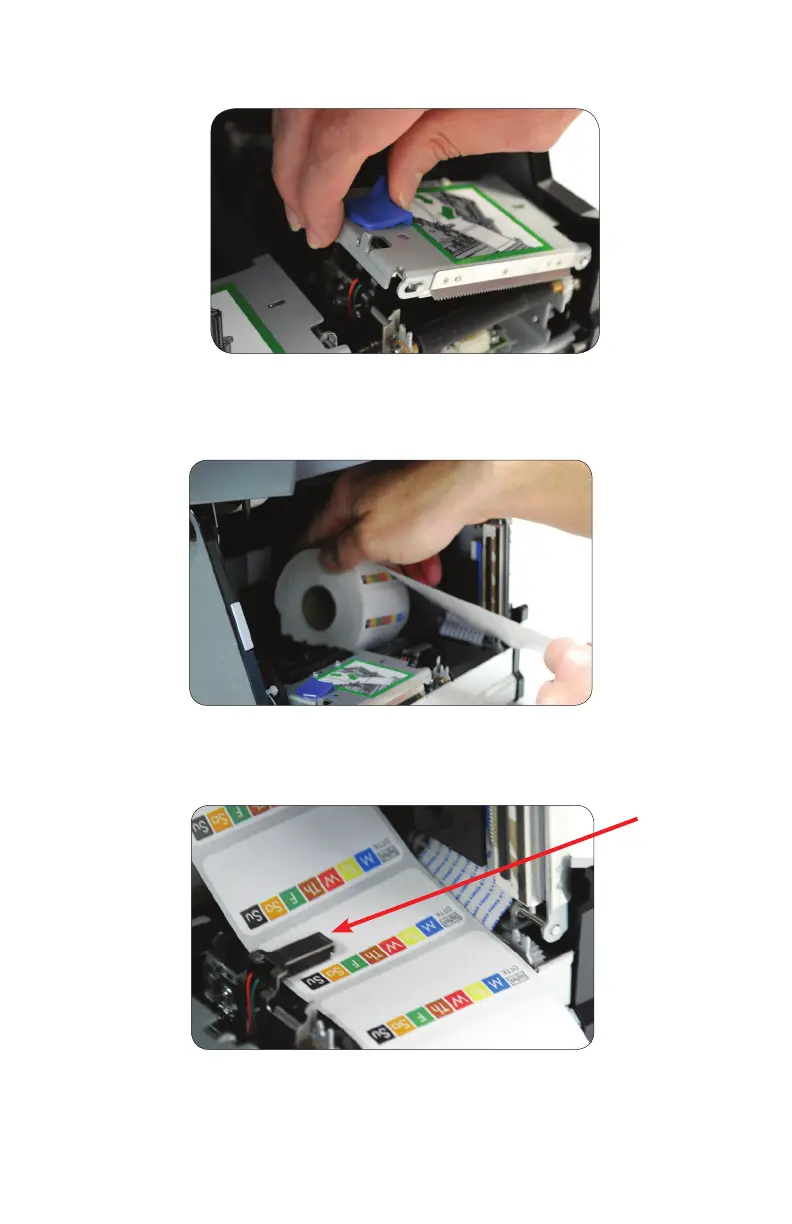 5. Place label stock under the sensor arm in printer mechanism as shown above. Be sure