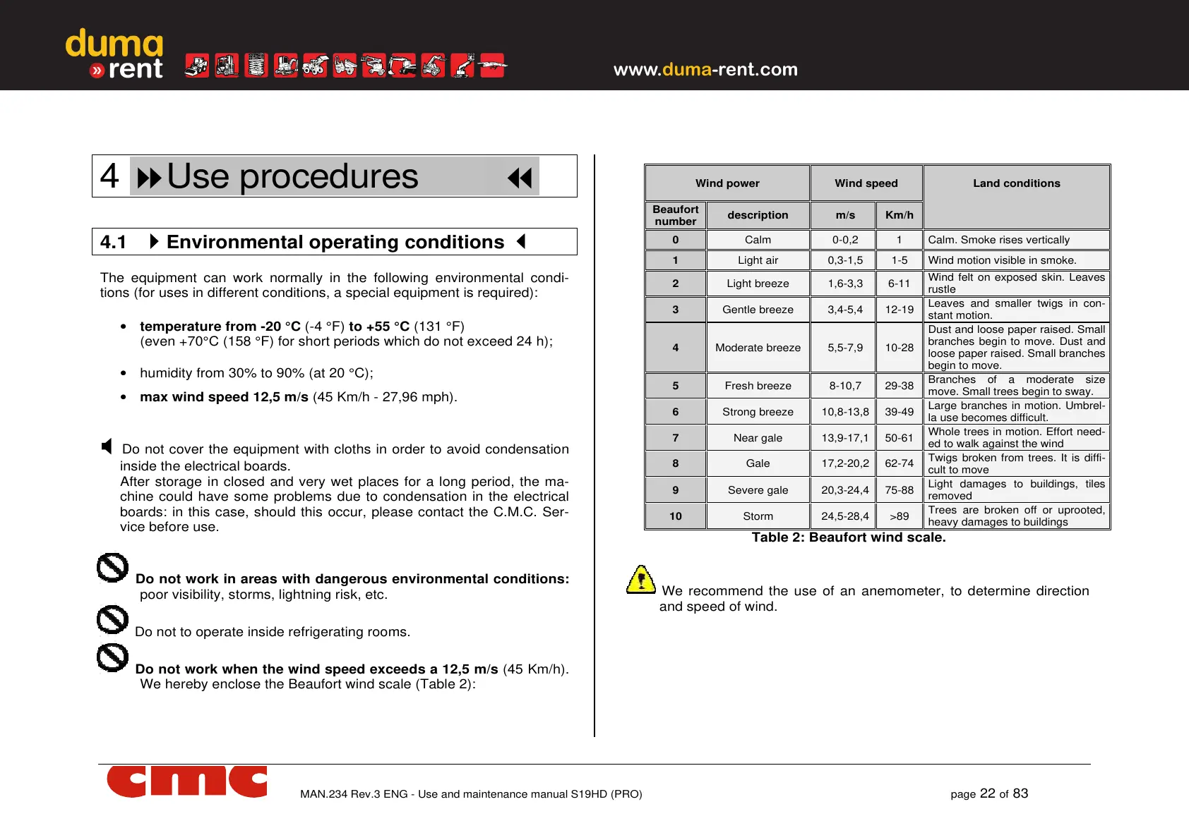 Do not work when the wind speed exceeds a 12,5 m/s (45 Km/h).