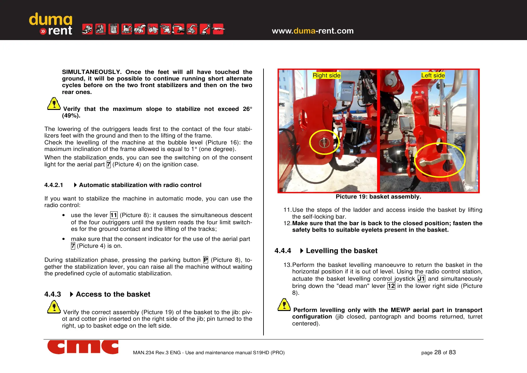 13. Perform the basket levelling manoeuvre to return the basket in the