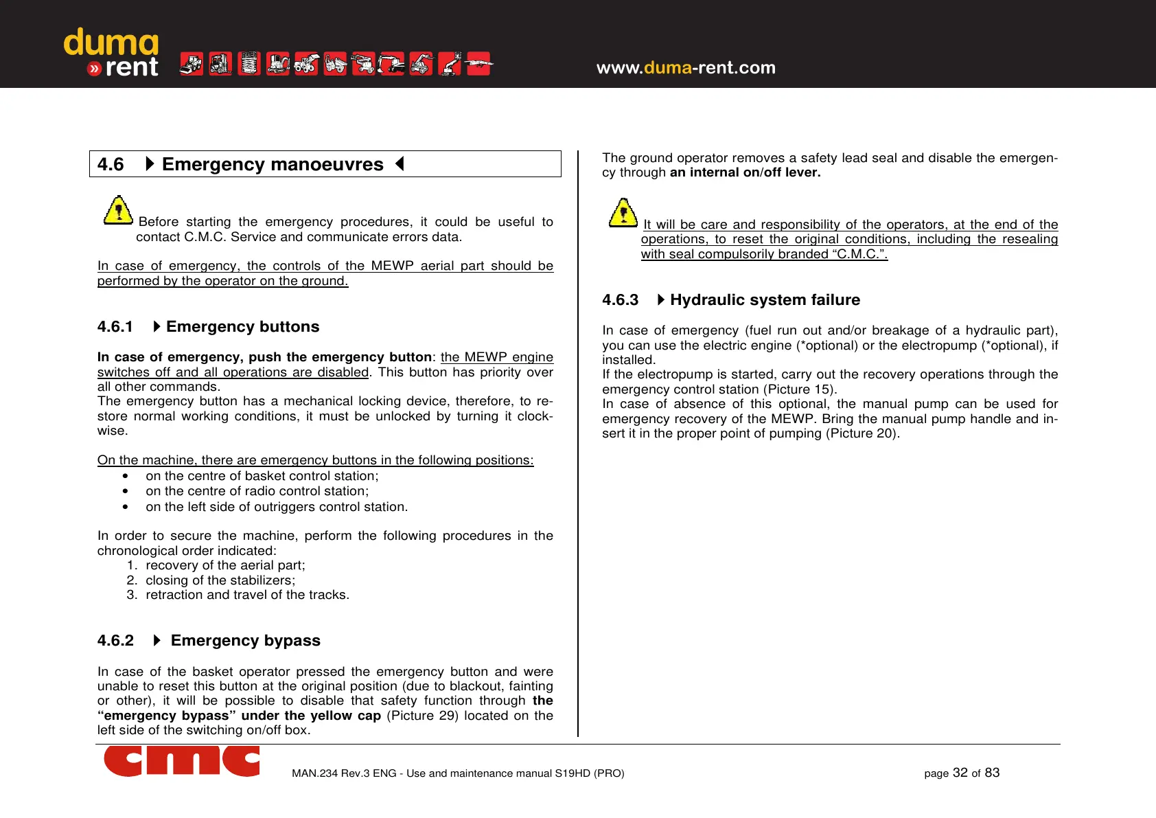emergency recovery of the MEWP. Bring the manual pump handle and in-