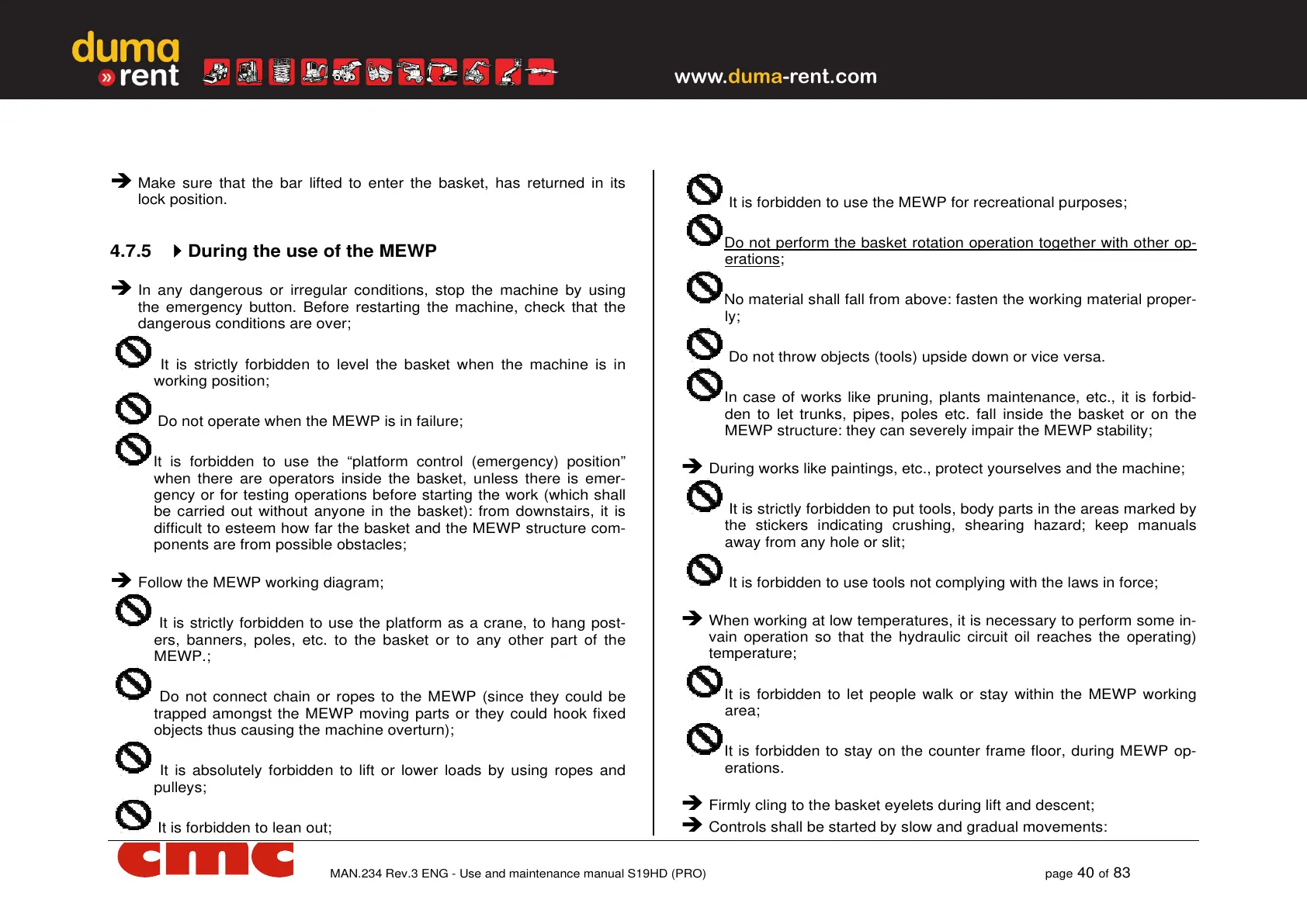 It is forbidden to stay on the counter frame floor, during MEWP op-