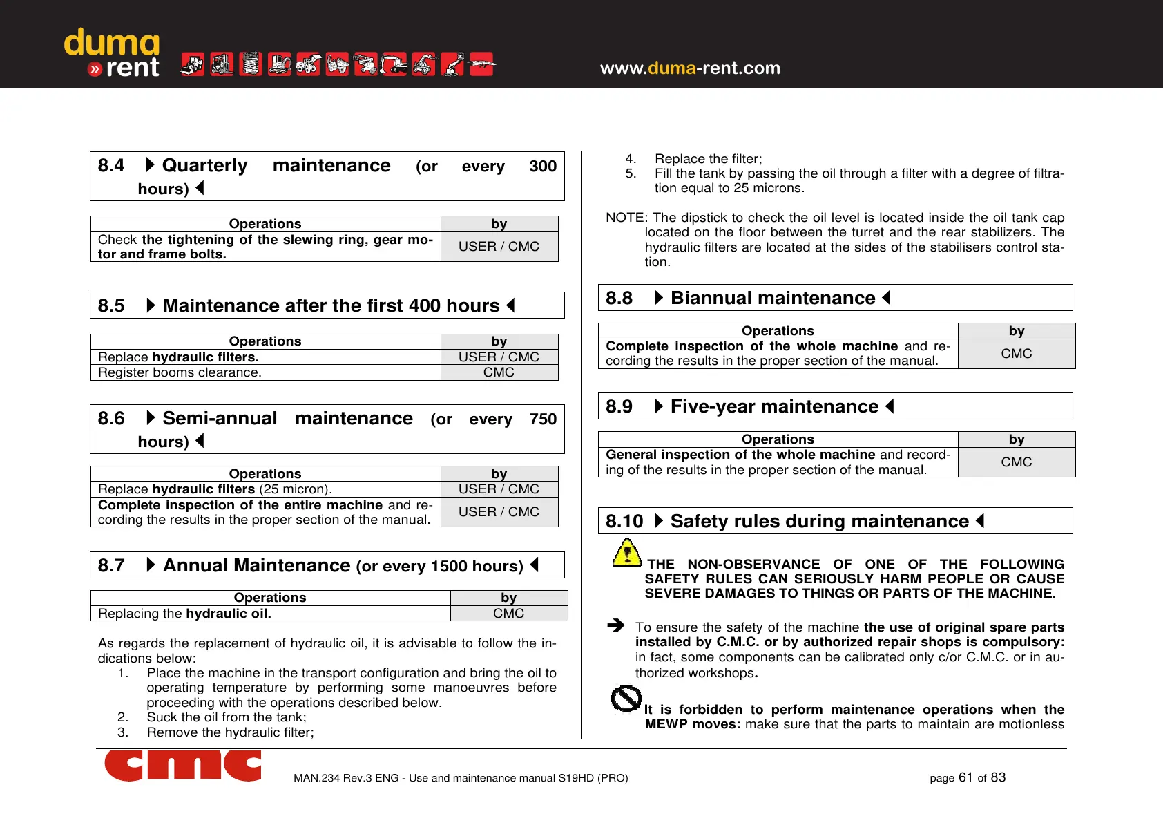 As regards the replacement of hydraulic oil, it is advisable to follow the in-