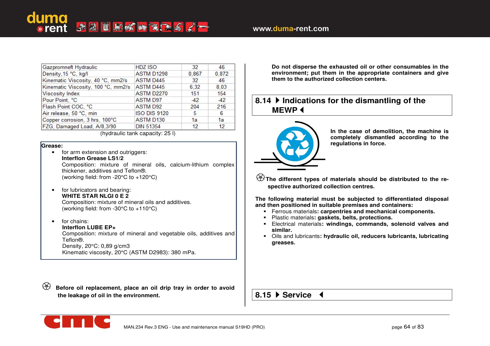 Oils and lubricants: hydraulic oil, reducers lubricants, lubricating