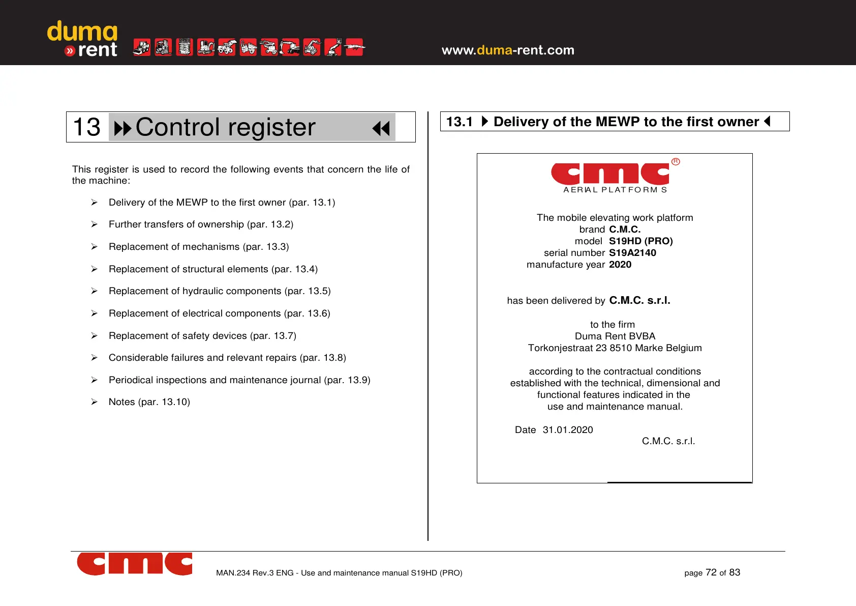 Delivery of the MEWP to the first owner (par. 13.1)