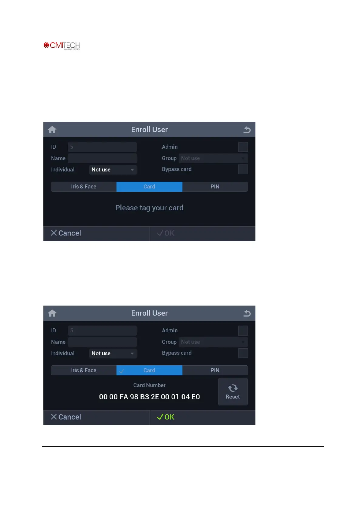 If "Please tag your card" message appears, touch front-bottom part of device with user card.
