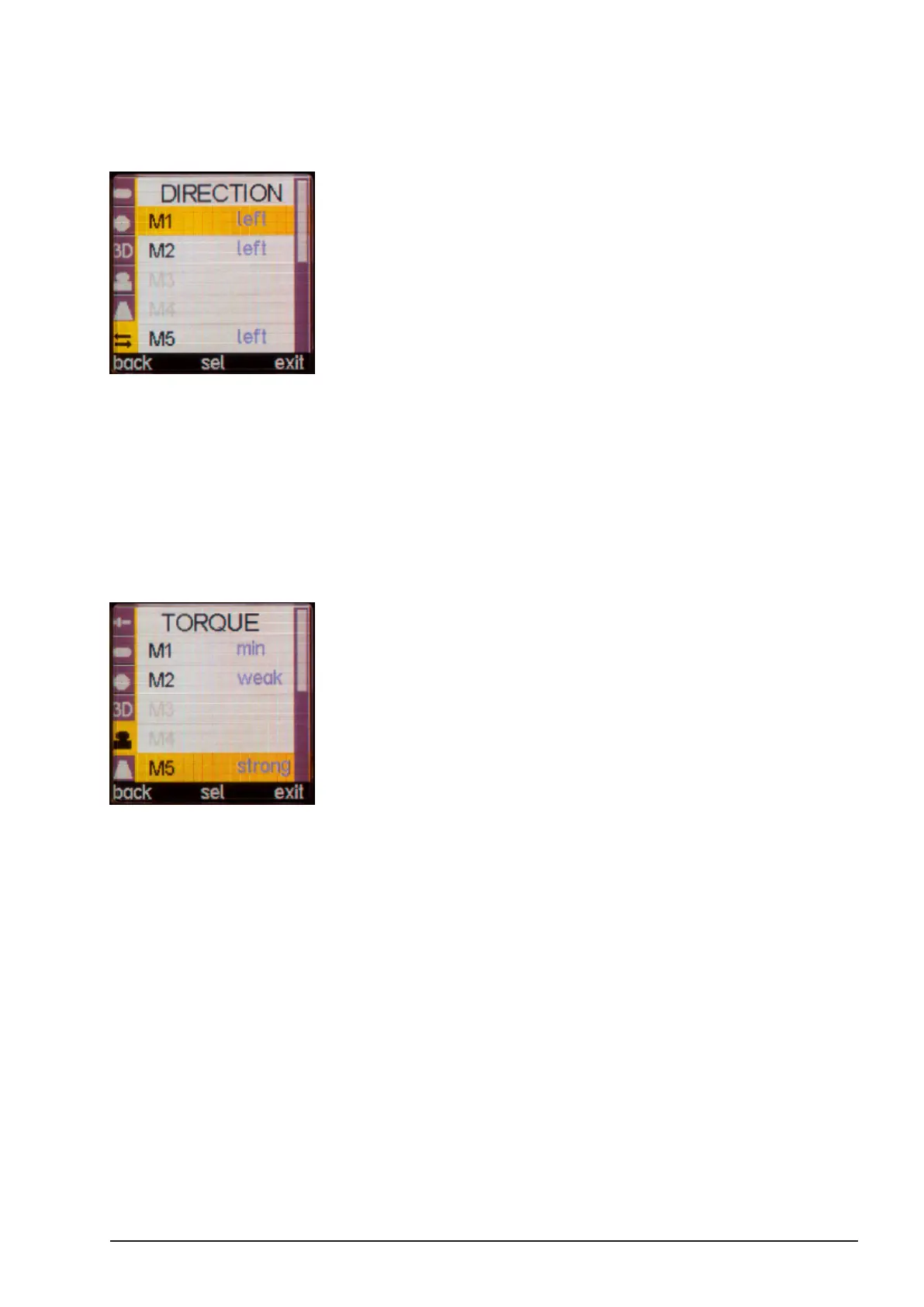 To adjust the motor torque for each motor, go to menu TORQUE and select the desired motor.