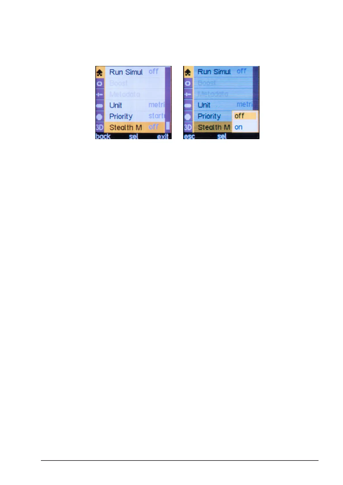 ■Select MAIN, “Stealth Mode” and press “sel”. Selct “on” and press “sel” again.