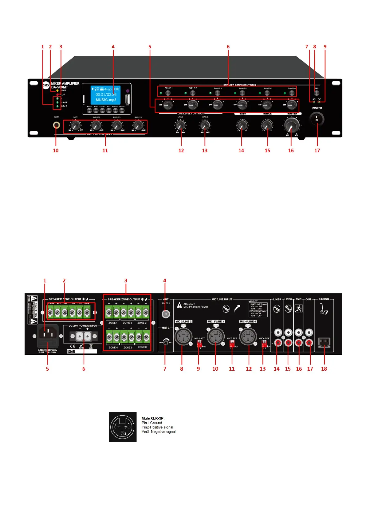 3. Speaker Zone 1-6 Outputs of 100 volt