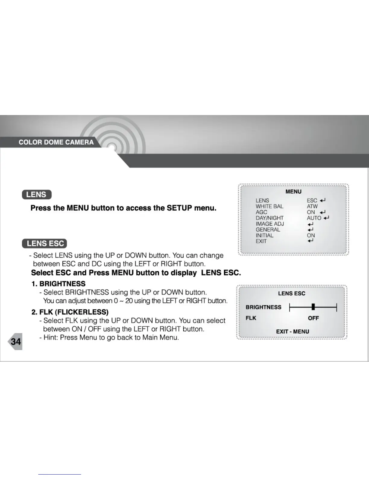 CNB DBM-24VF - OPERATING CAMERA - LENS SETTINGS (ESC); Brightness Adjustment