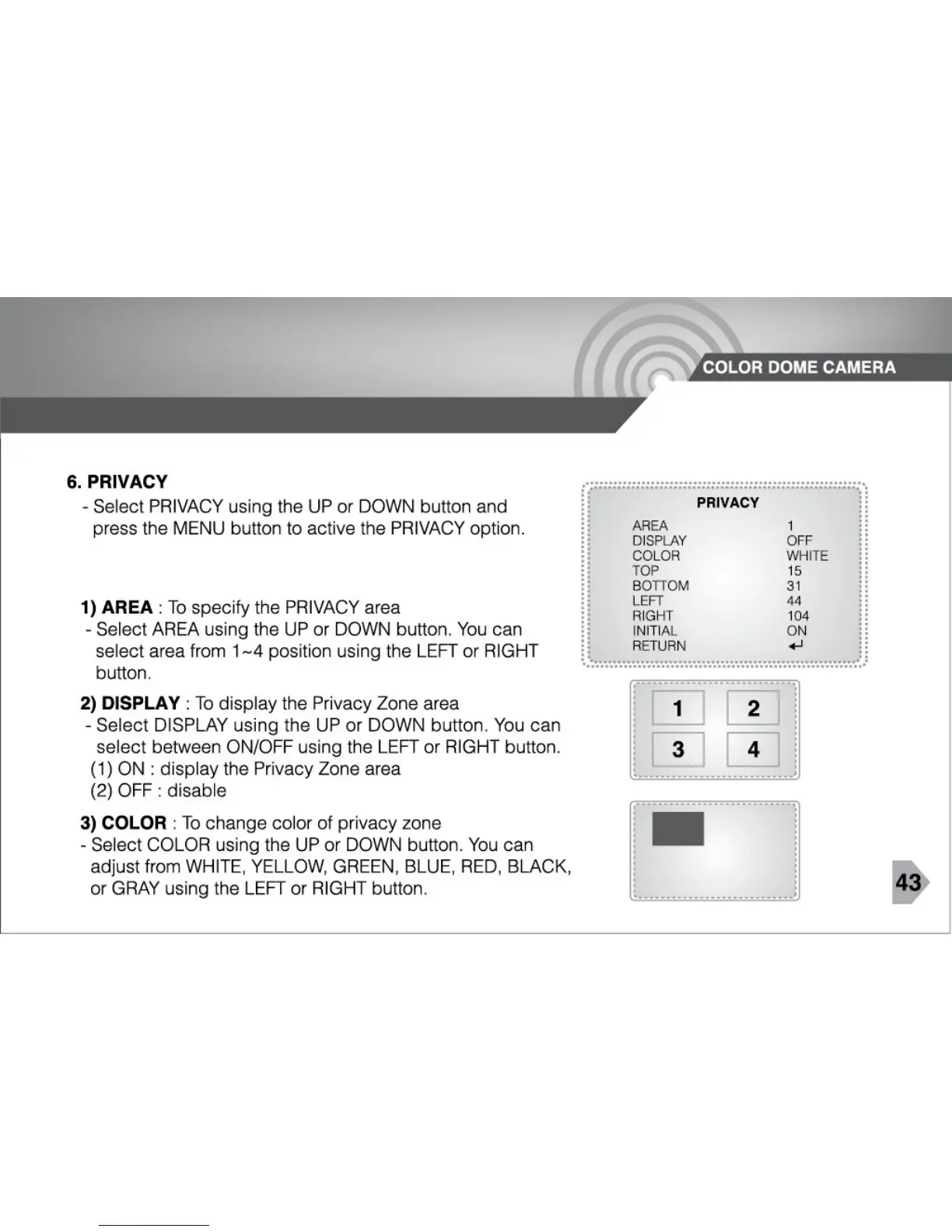 CNB DBM-24VF - OPERATING CAMERA - PRIVACY SETTINGS; Privacy Area Specification; Privacy Zone Display; Privacy Zone Color Selection
