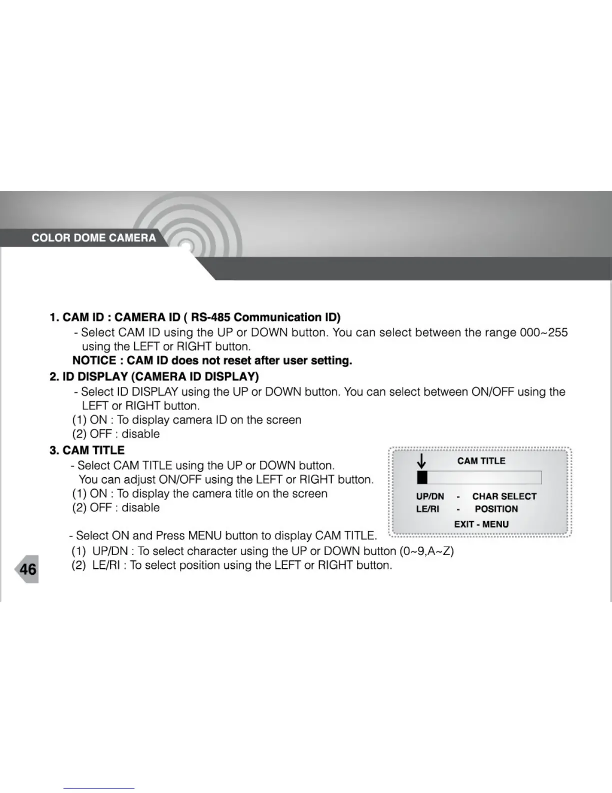 CNB DBM-24VF - OPERATING CAMERA - GENERAL SETTINGS (CAM ID;DISPLAY;TITLE); Camera ID (CAM ID) Configuration; ID Display Setting; Camera Title (CAM TITLE) Setting