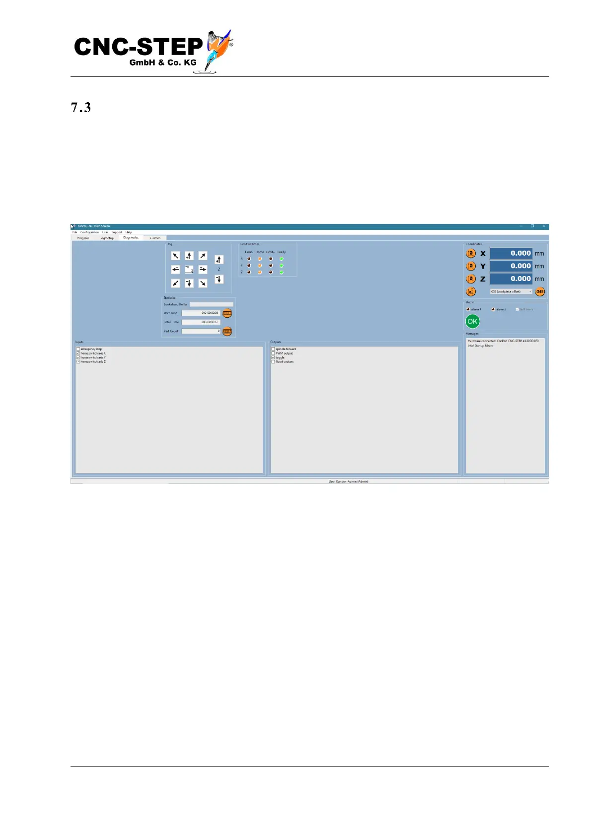 In addition to the known coordinate display and the message window, the status of the inputs and
