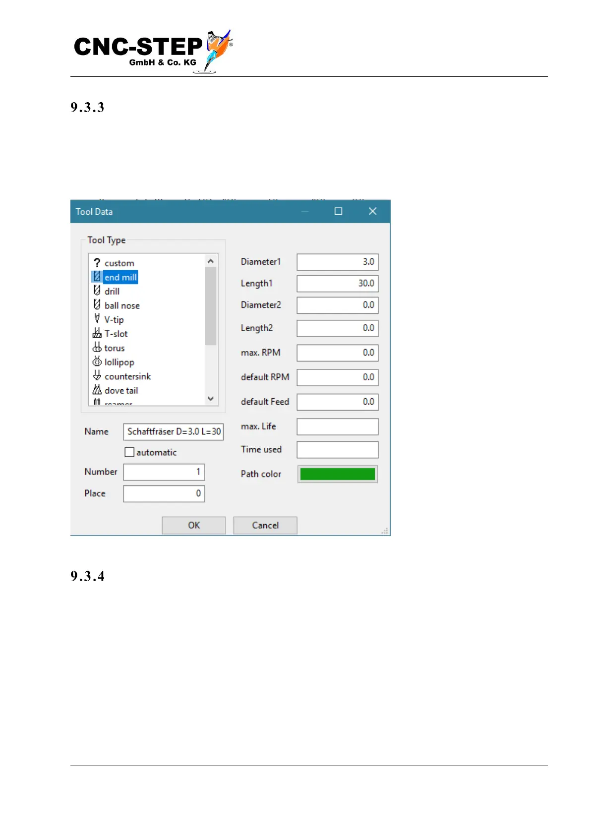 new tool. The type and parameters of the tool can be entered. Standing times and max. Speed is