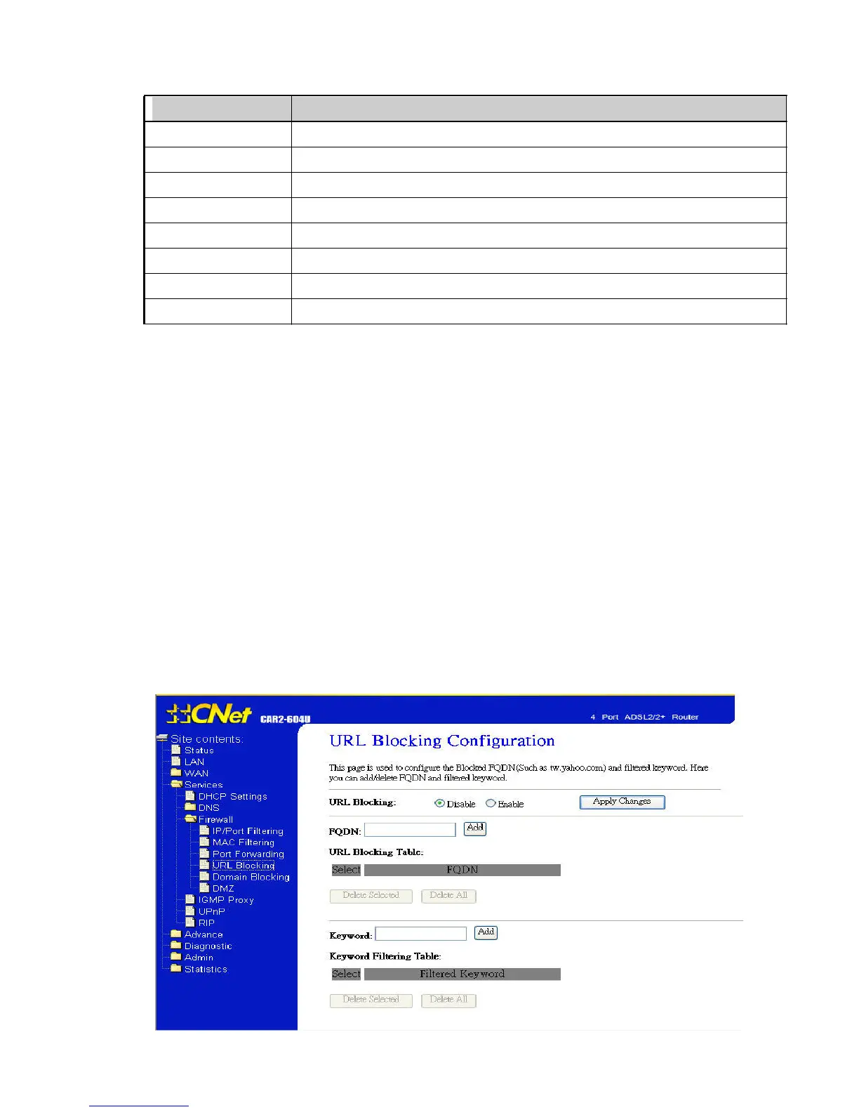 This page is used to configure the Blocked FQDN(Such as tw.yahoo.com) and filtered