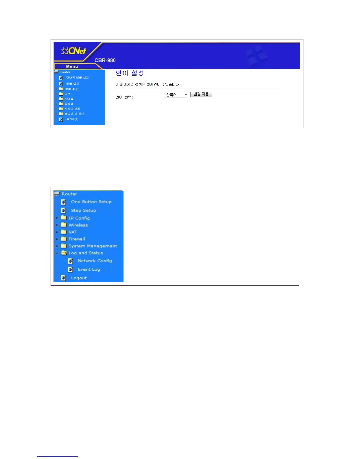 CNET CBR-980 - Log & Status; Network Config