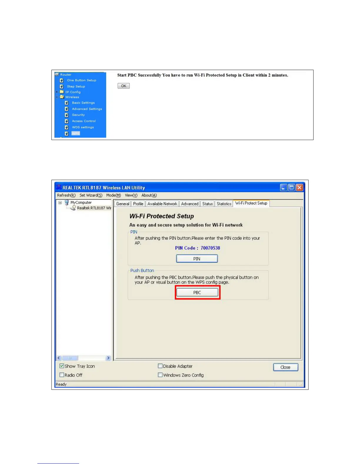 (3) Open the configuration page of the wireless card. Click the Wi-Fi Protect Setup, and then click
