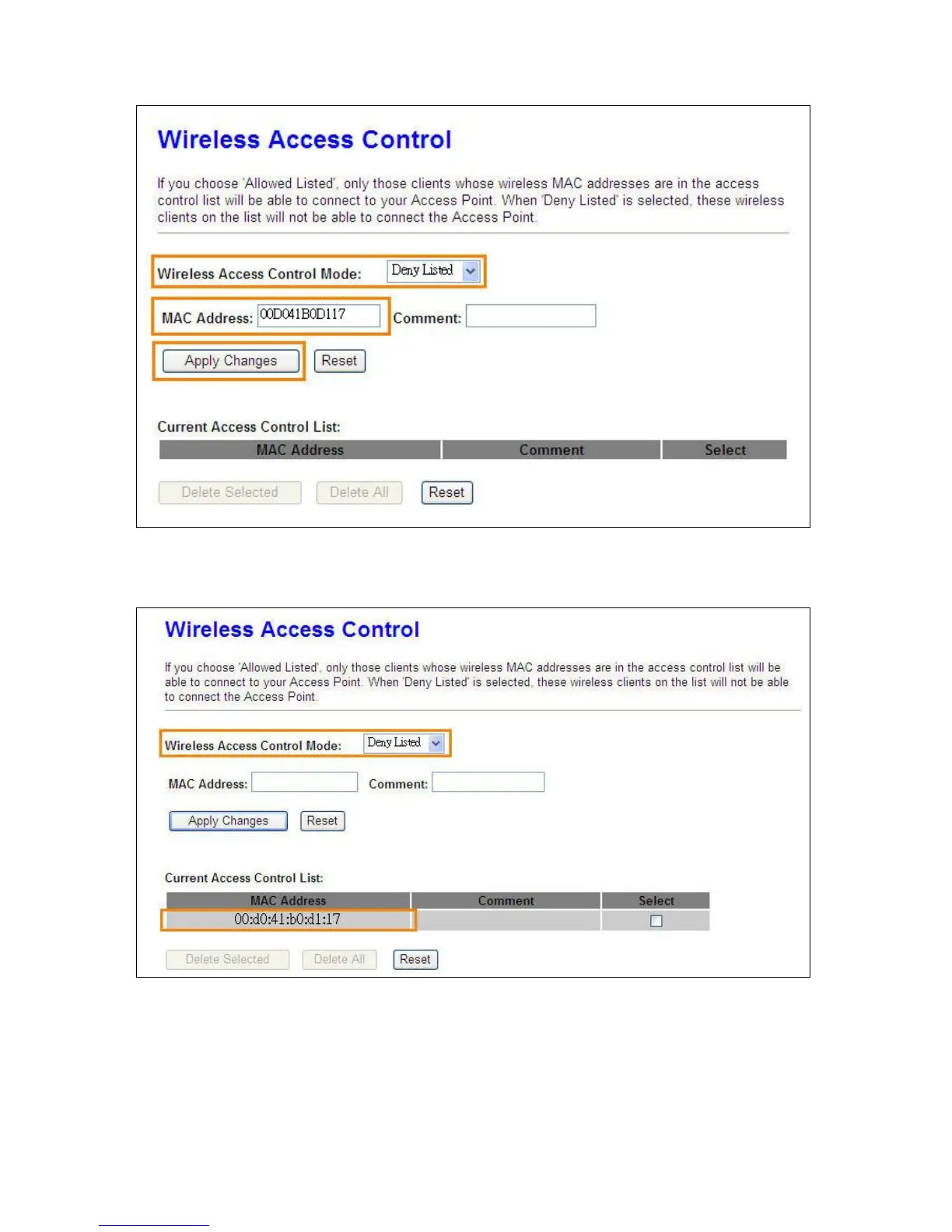 (2) You will find out that the MAC address appears on Current Access Control List, it means the