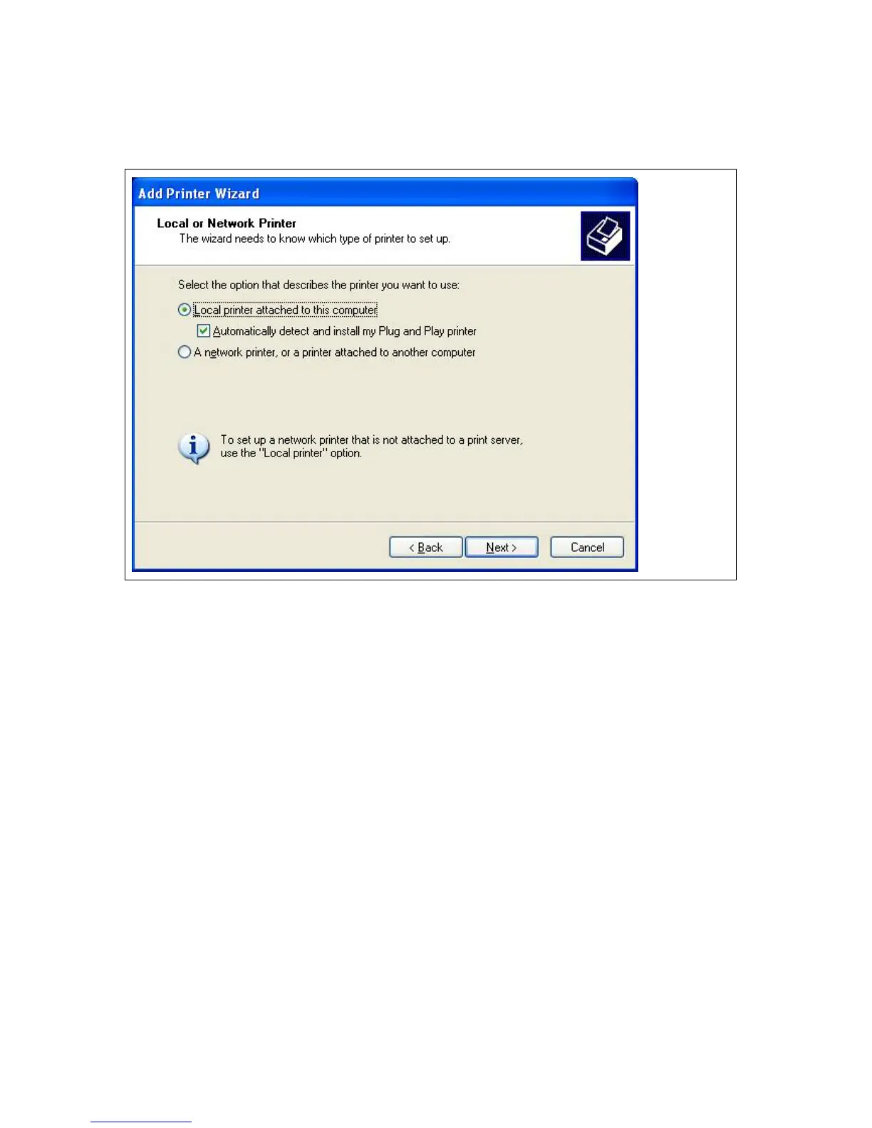 Click the “Local printer attached to this computer”, and then clickNext”.