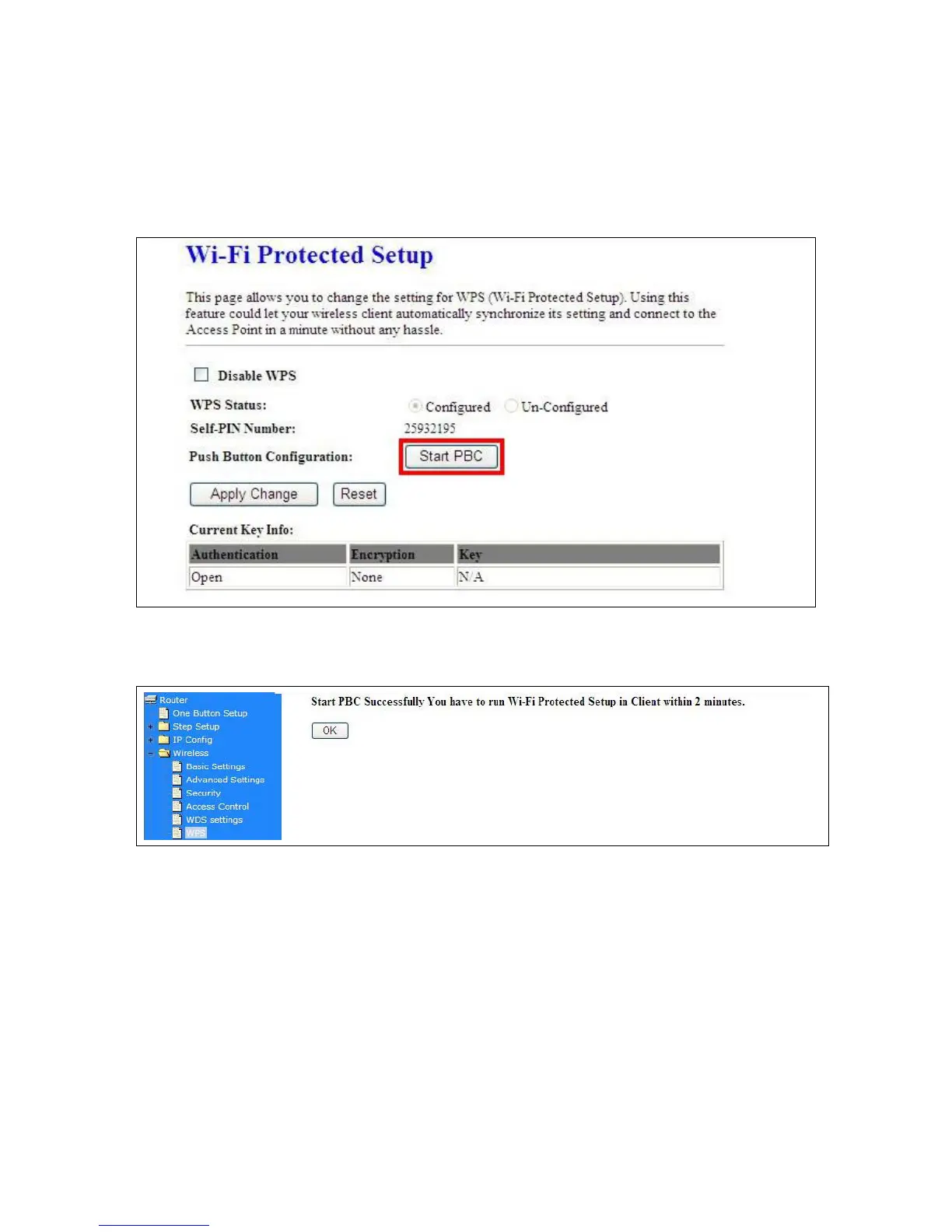 This page supports Start PBC and Start PIN; please follow the instructions to operate.