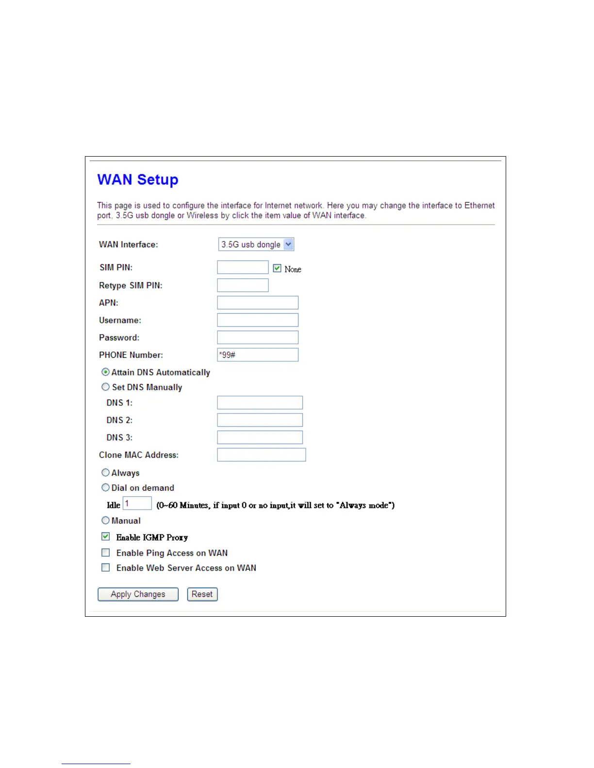 5.1.1.2 WAN Interface – 3.5G USB Dongle