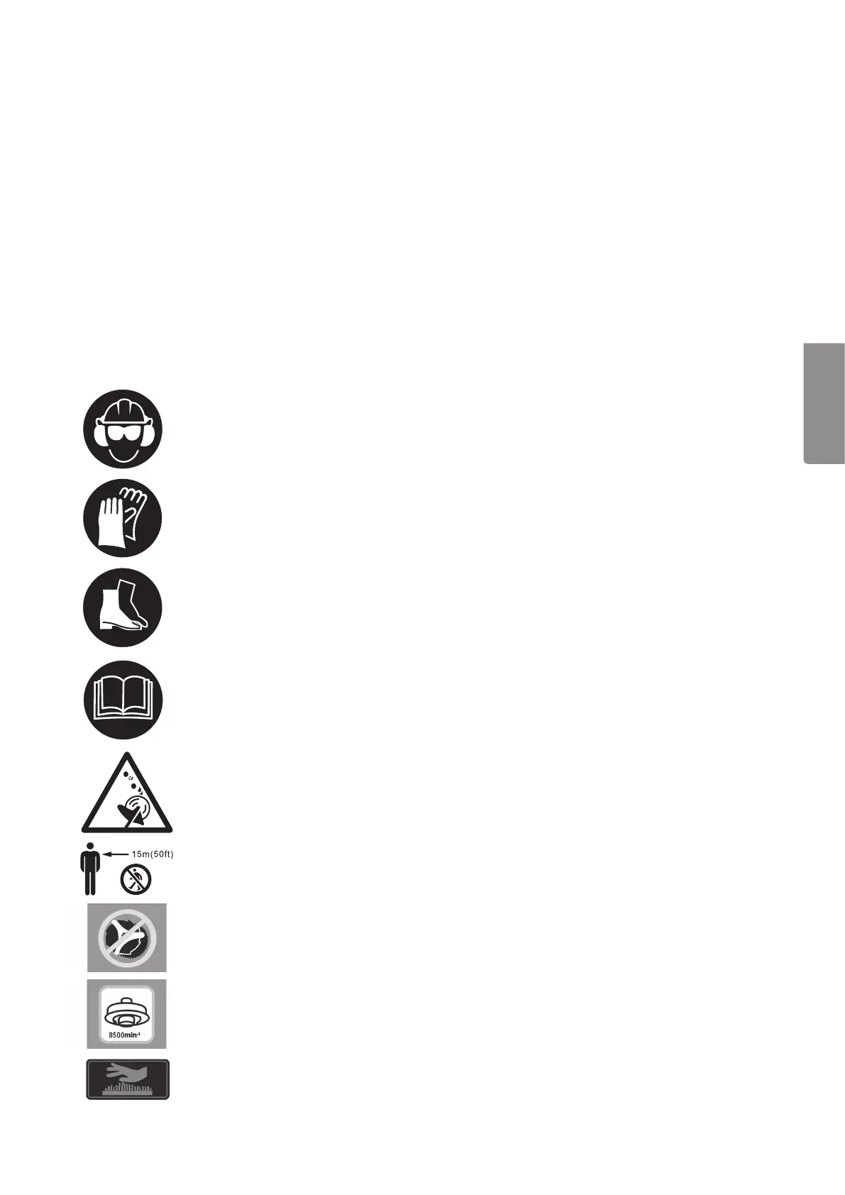 Advarsel: Barn, dyr og tilskuere skal være på enavstand på minst 15 meter fra gresstrimmeren når den brukes.