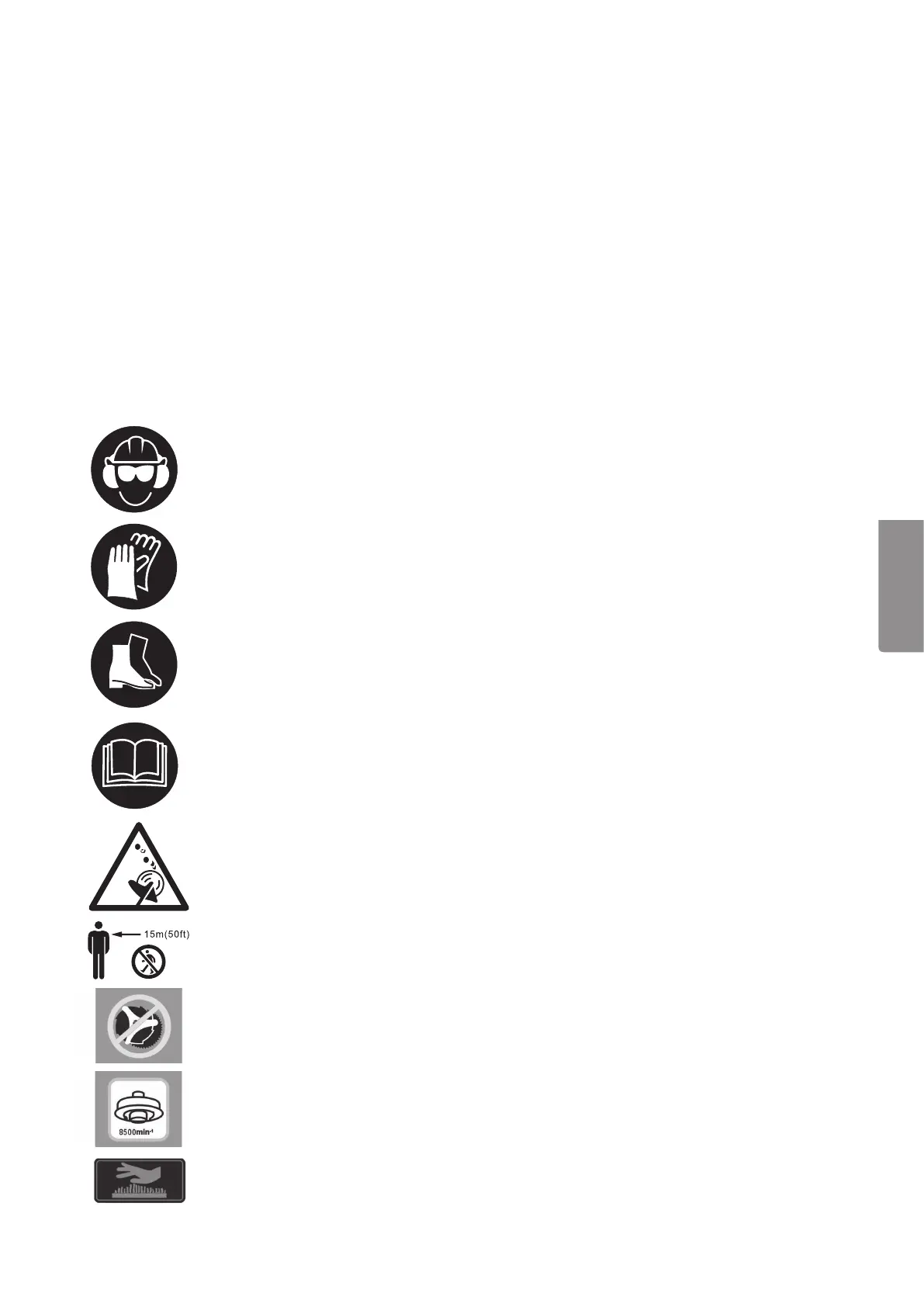 Varoitus: Lasten, kotieläinten ja muiden ulkopuolisten tulisi olla vähintään 15 metrin etäisyydellä trimmeristä, kun