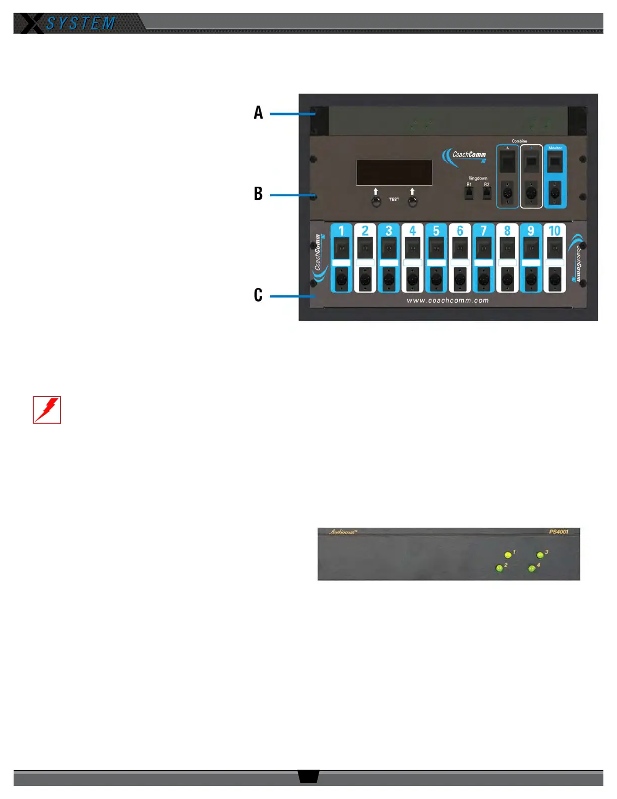 Both the Press Box Unit and the Sideline Cart have integrated power supplies. These power supplies provide power for each