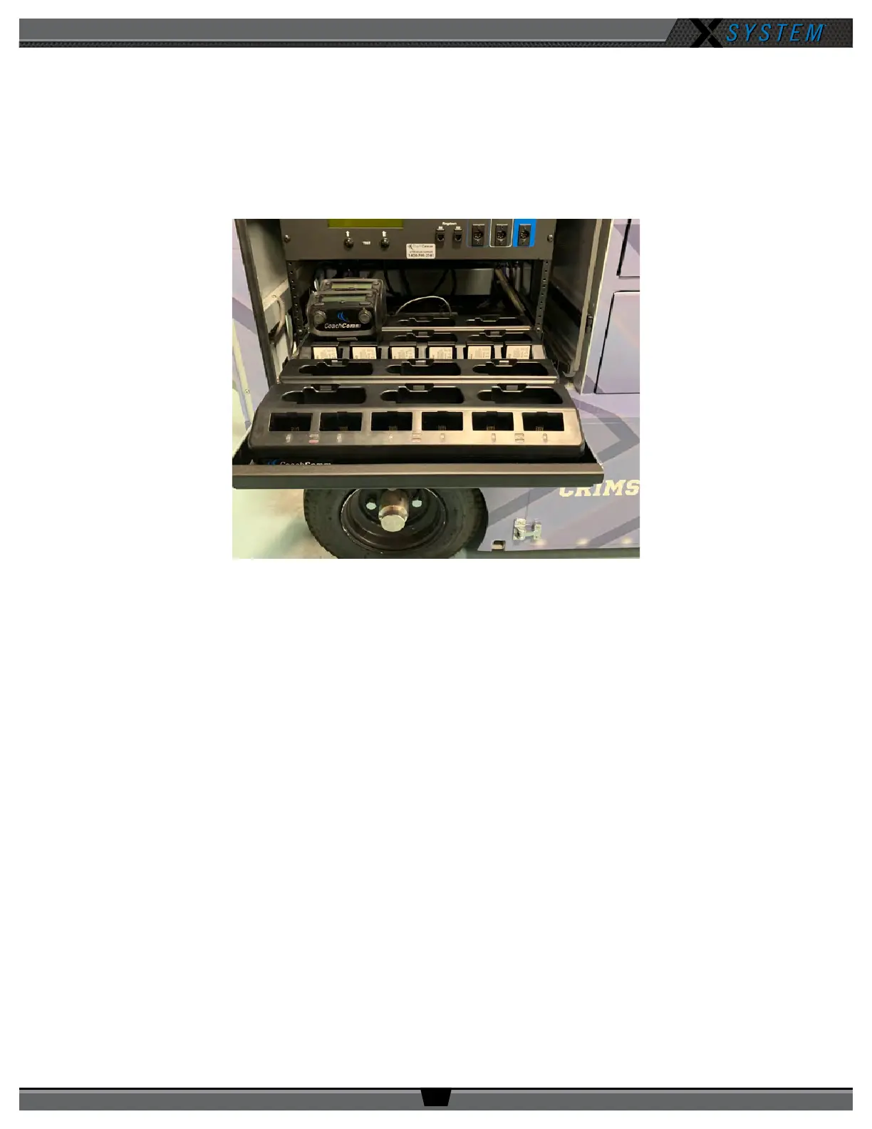 This charger may be located in the rack of the Sideline Cart or in the shelf of the Wireless Press Box Unit. (See the Appendix