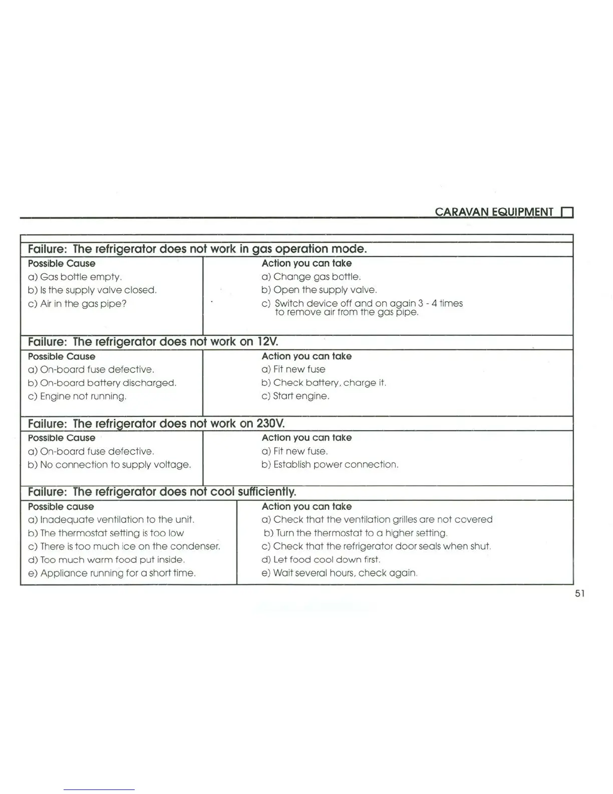 Coachman 2004 Amara - Failure: The refrigerator does not work in gas operation mode.; Failure: The refrigerator does not work on 12 V.; Failure: The refrigerator does not work on 230 V.; Failure: The refrigerator does not cool sufficiently.