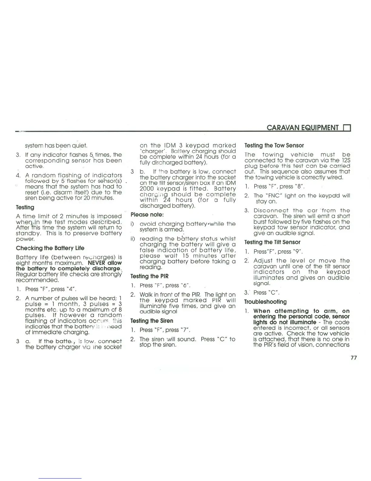 Coachman 2004 Amara - Checking the Battery Life; Testing the PIR; Testing the Siren; Testing the Tow Sensor and the Tilt Sensor