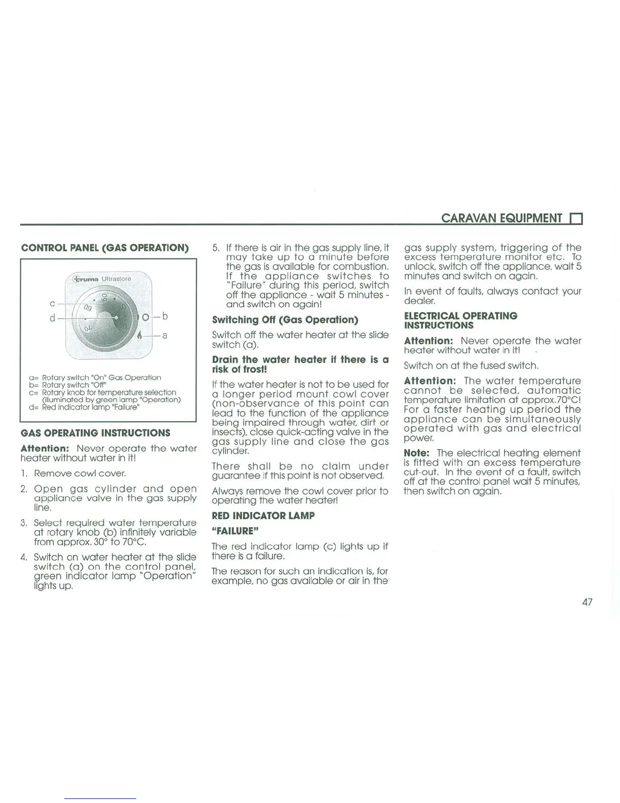 Coachman Amara - Control Panel (Gas Operation); Gas Operating Instructions; Switching off (Gas Operation); Electrical Operating Instructions