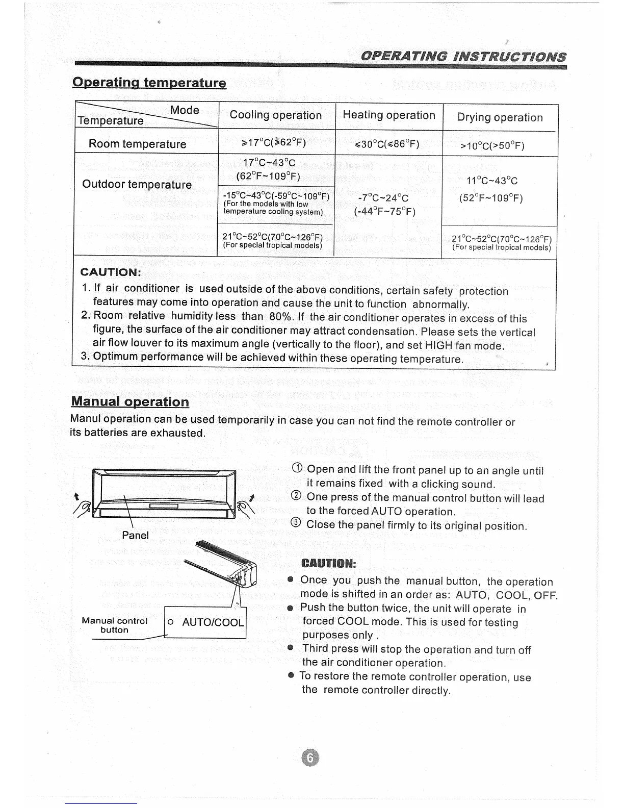 Coaire Split-Type Room Air Conditioner - Operating Temperature; Manual Operation