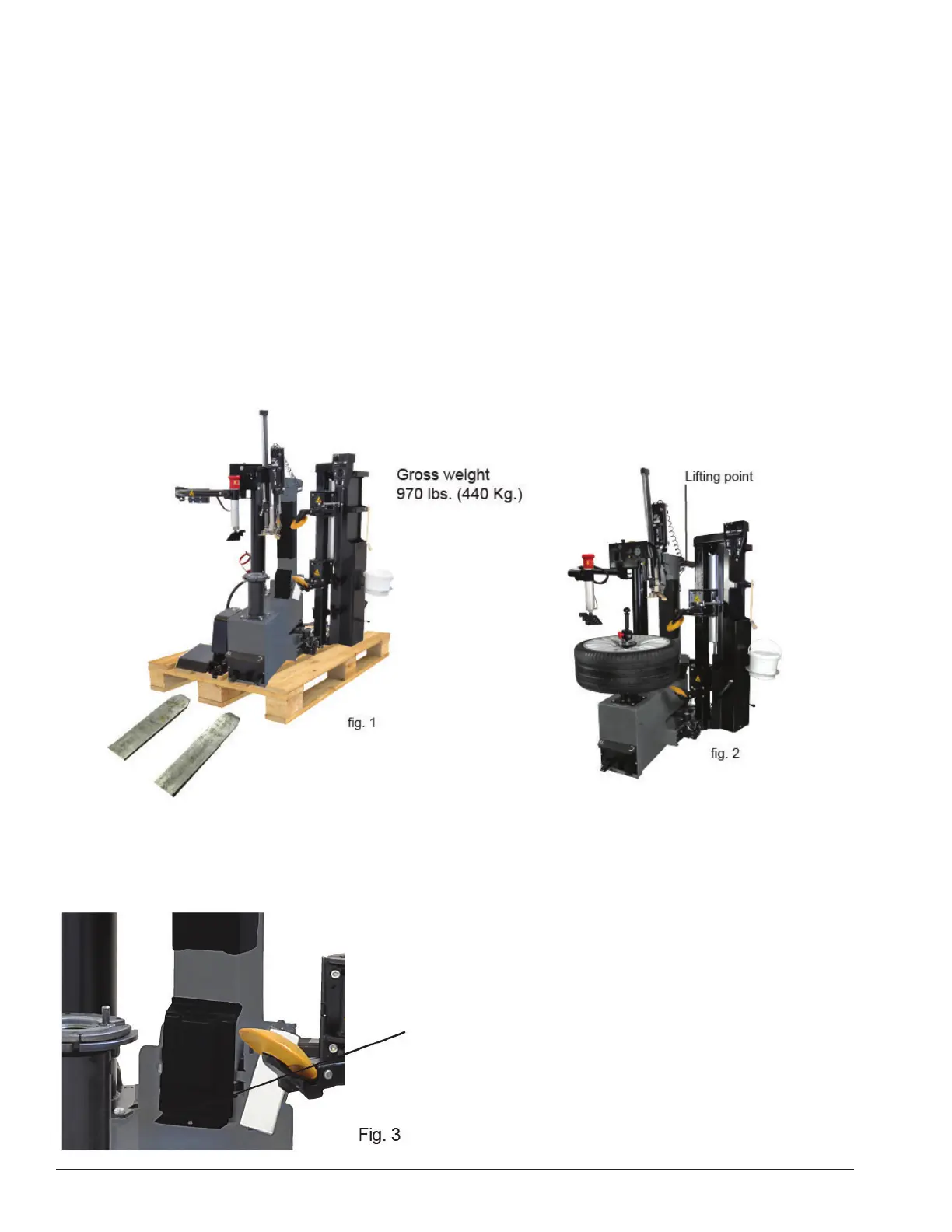 Use lifting equipment of suitable load-bearing capacity that is able to take the weight of the tire changer.