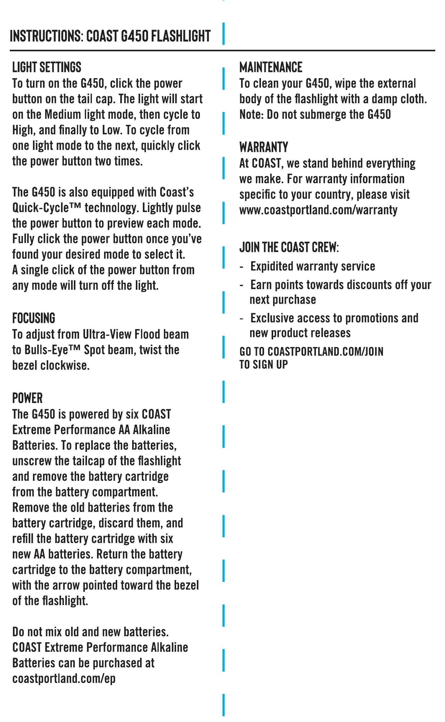 INSTRUCTIONS: COAST6450 FLASHLIGHT