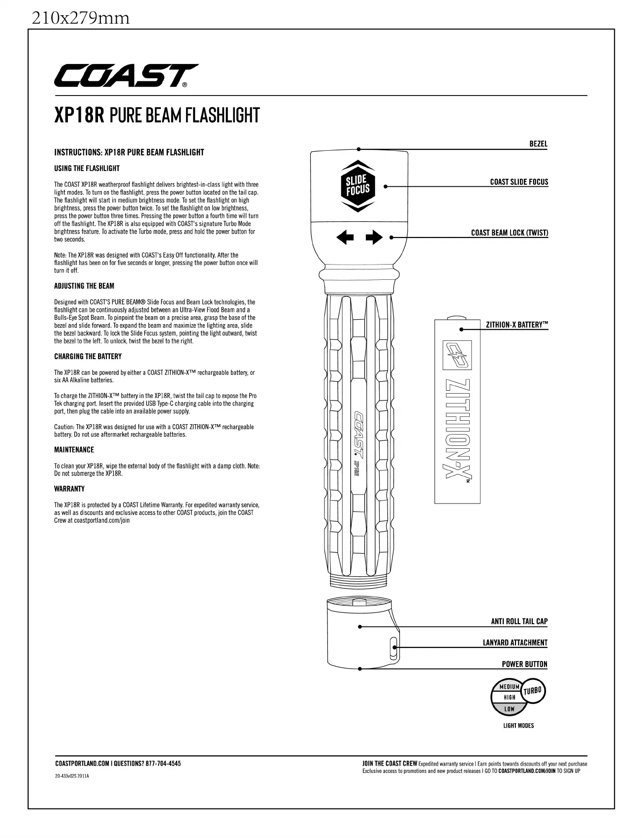Coast XPH34R - XP18 R Pure Beam Flashlight Instructions; Using the Flashlight; Beam Adjustment and Focus; Battery Charging