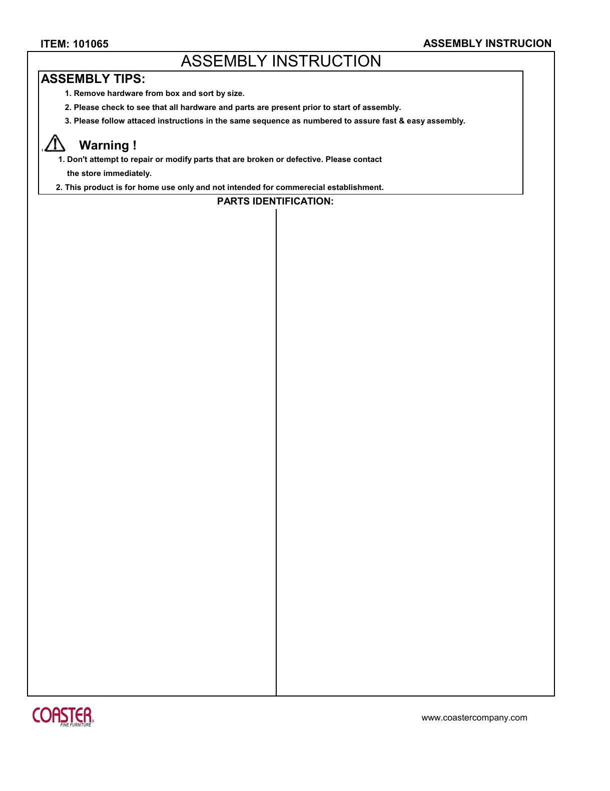 2. Please check to see that all hardware and parts are present prior to start of assembly.