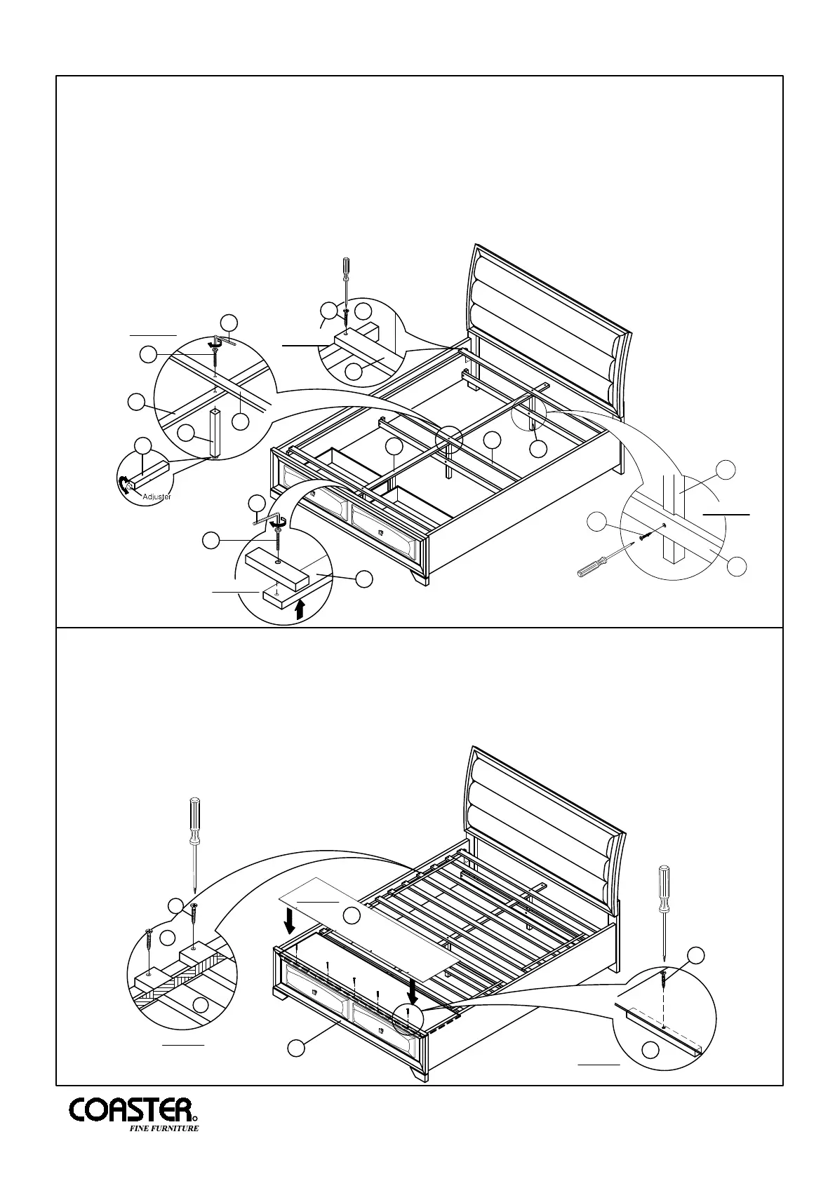 5.3 Align and fasten bed slat with 3 holes (G) to bed rails (F) using long flat head screw (9) and tighten with