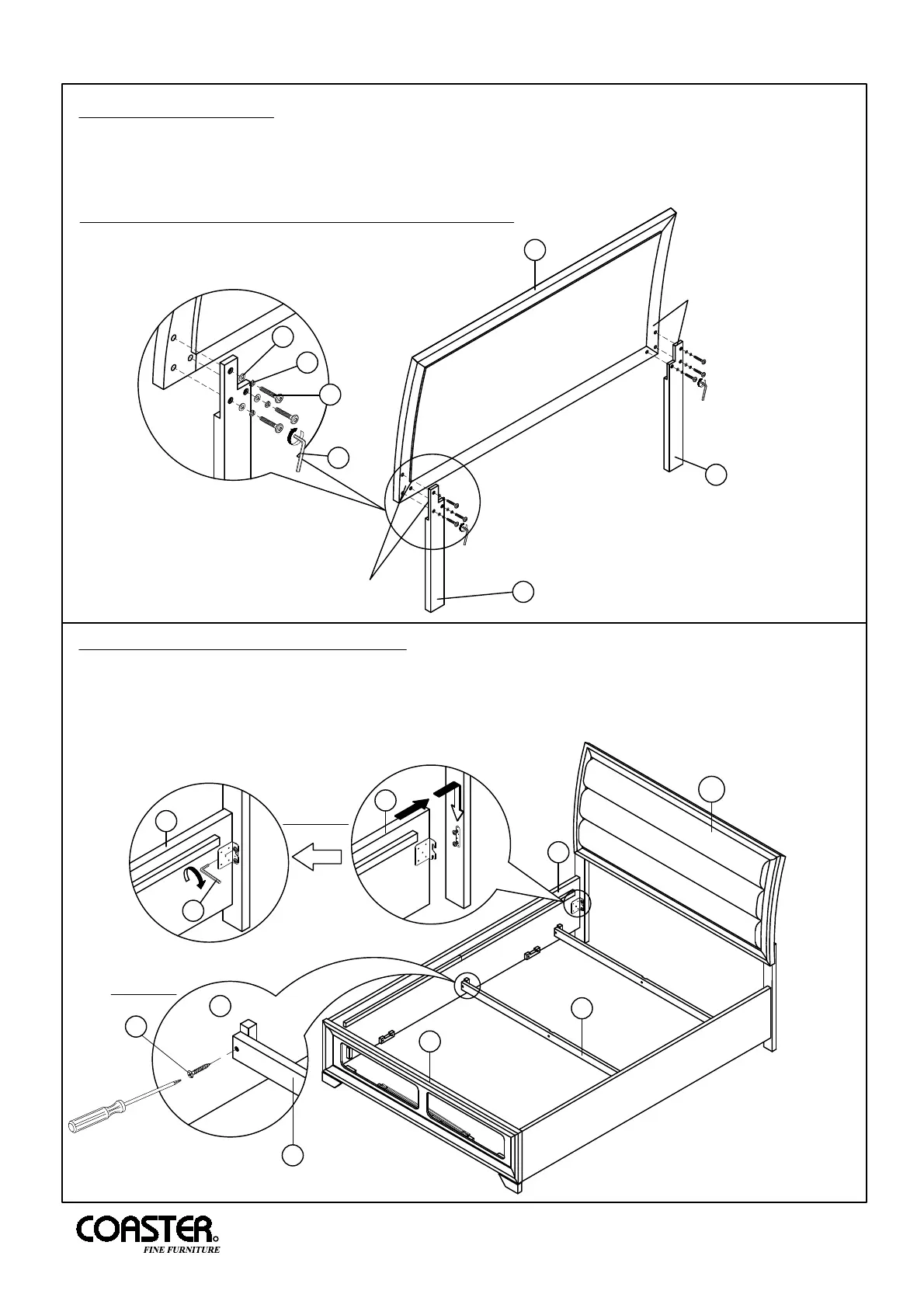 2.1 Loosen the bolt and align and fasten bed rail (F) to headboard (HB) and footboard (D) using the bolt