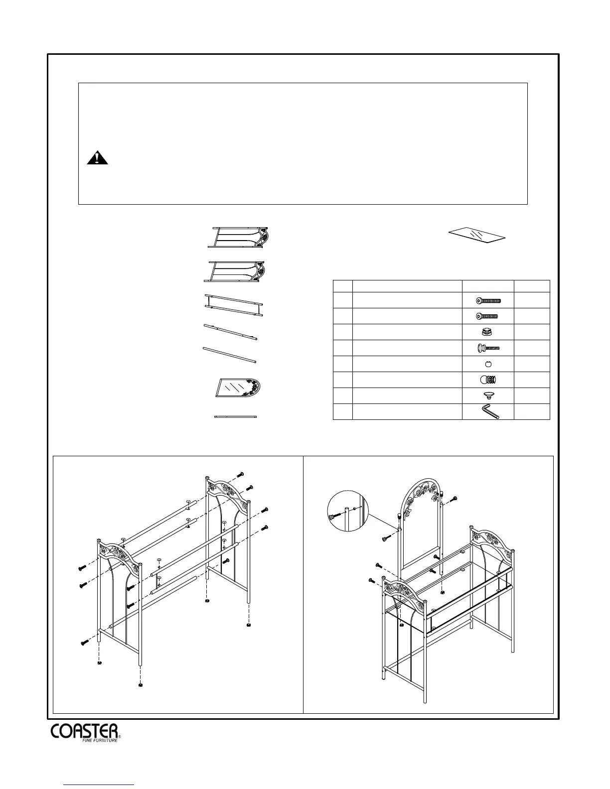 2. Please check to see that all hardware and parts are present prior to start of assembly.