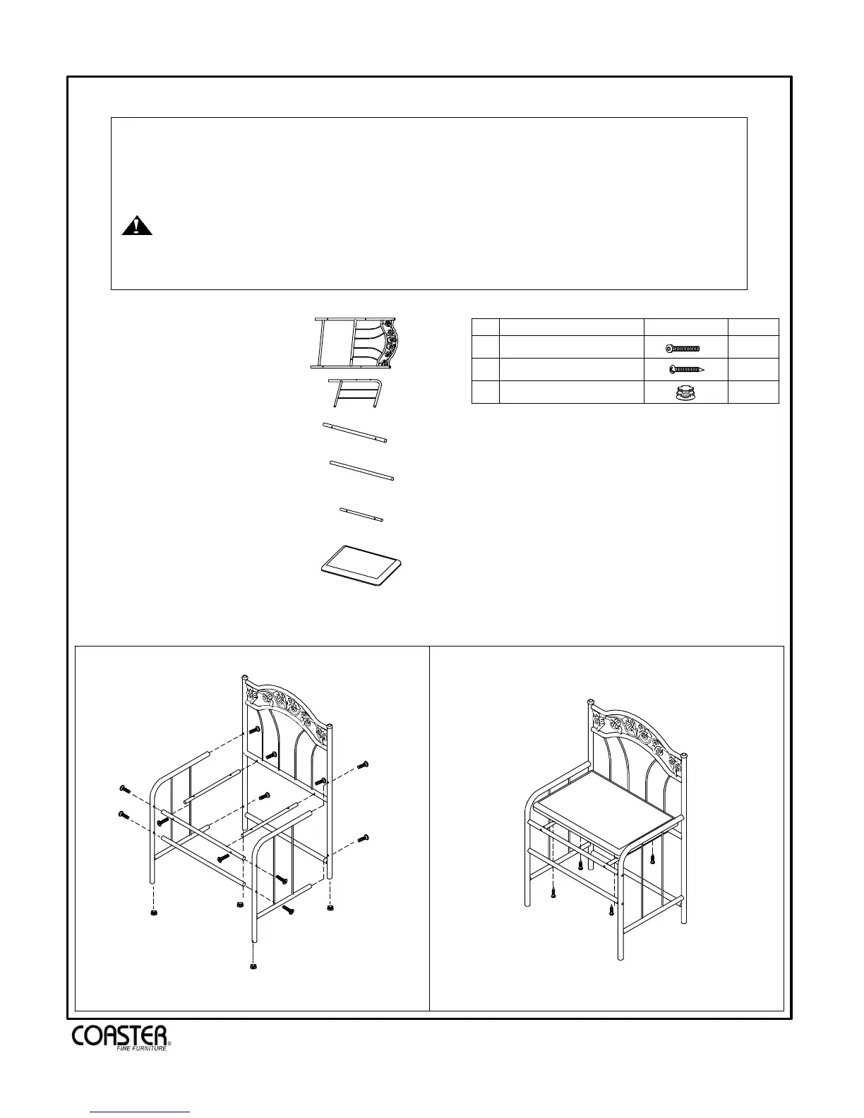 2. Please check to see that all hardware and parts are present prior to start of assembly.