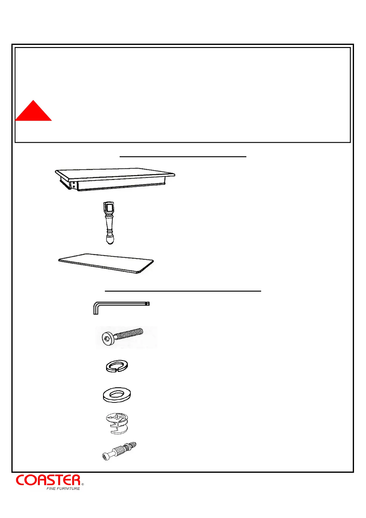 2. Please check to see that all hardware and parts are present prior to start of assembly.