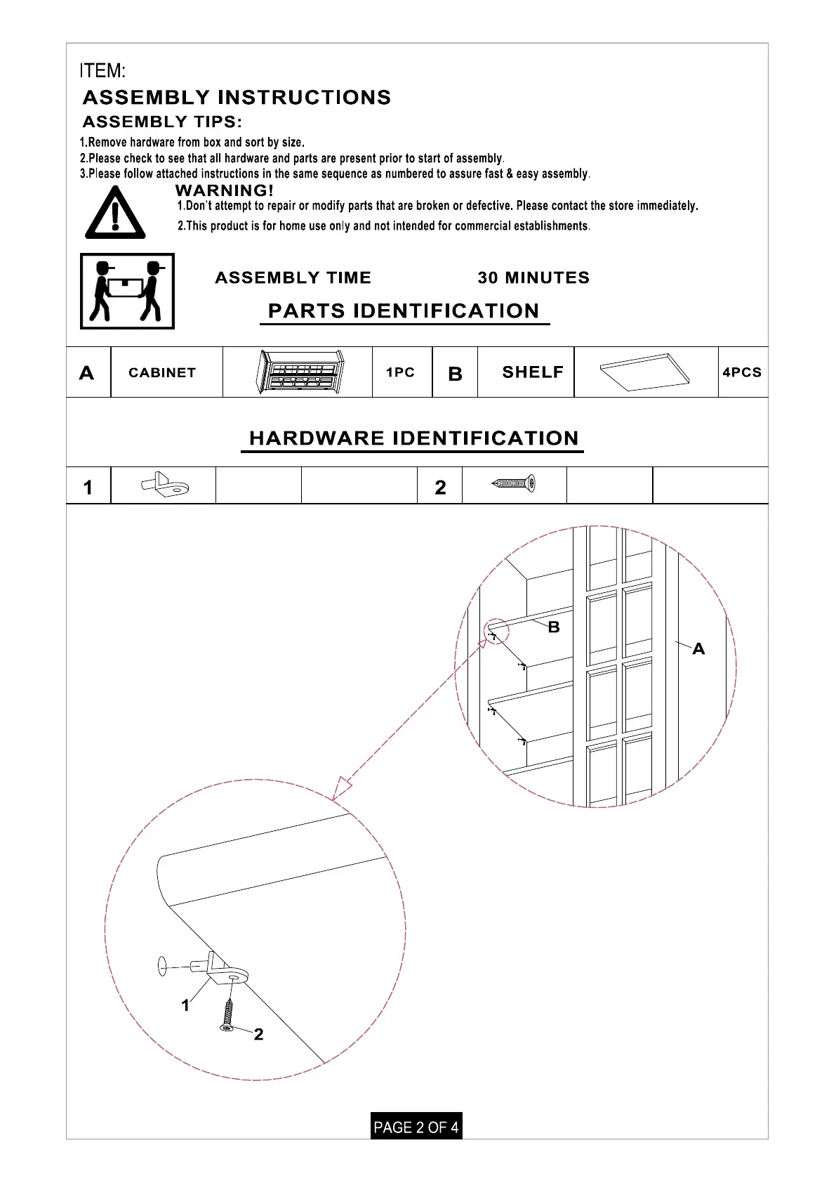 Coaster CURIO CABINET - Assembly Tips; Assembly Safety Warning; Parts Identification; Hardware Identification